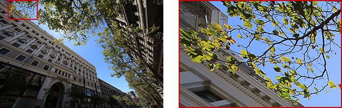 通過采用UD(超低色散)鏡片、超級UD鏡片以及新的光學(xué)設(shè)計,使超廣角鏡頭上容易產(chǎn)生的倍率色像差得到了很好的抑制。廣角端處的倍率色像差被控制得很好,從而使被攝體邊緣的顏色錯位現(xiàn)象得到減輕,最終獲得高畫質(zhì)。