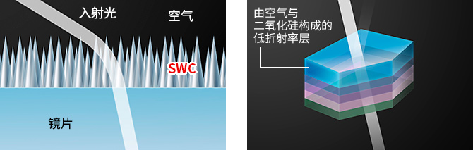 在鏡片表面覆蓋了包含二氧化硅與空氣的具有低折射率的ASC鍍膜,和在鏡片表面排列眾多納米級楔形結(jié)構(gòu)的SWC亞波長結(jié)構(gòu)鍍膜,可有效抑制入射角較小的正面受光和入射角較大的側(cè)面受光造成的反射。這兩項鍍膜技術(shù)可以有效地抑制鬼影和眩光的產(chǎn)生。